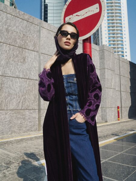 The Artaal Wrap abaya, featuring a lavender wrap, is available in black or navy blue.